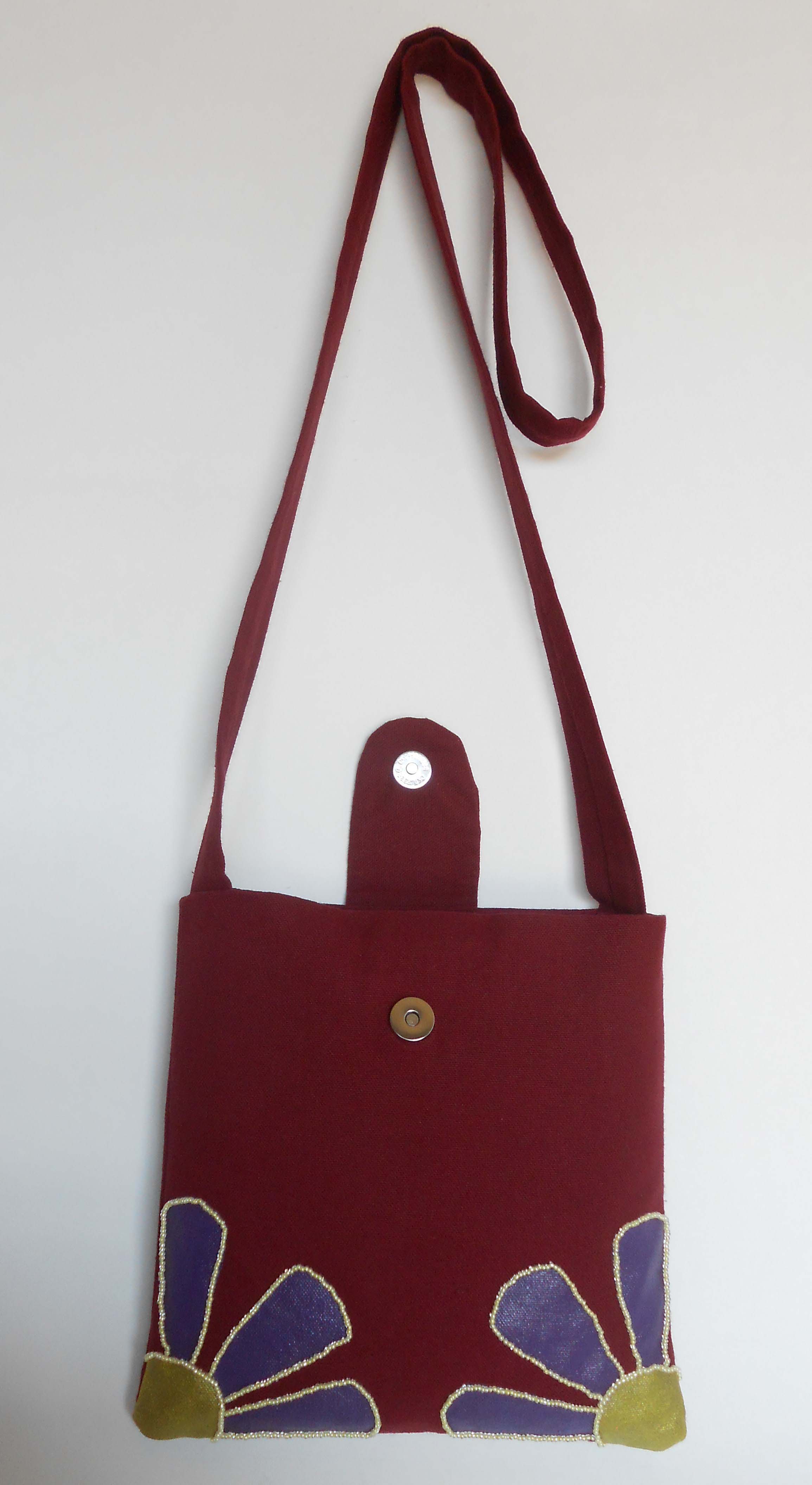 Burgundy handbag with 1 pocket in the back, and one inside pocket